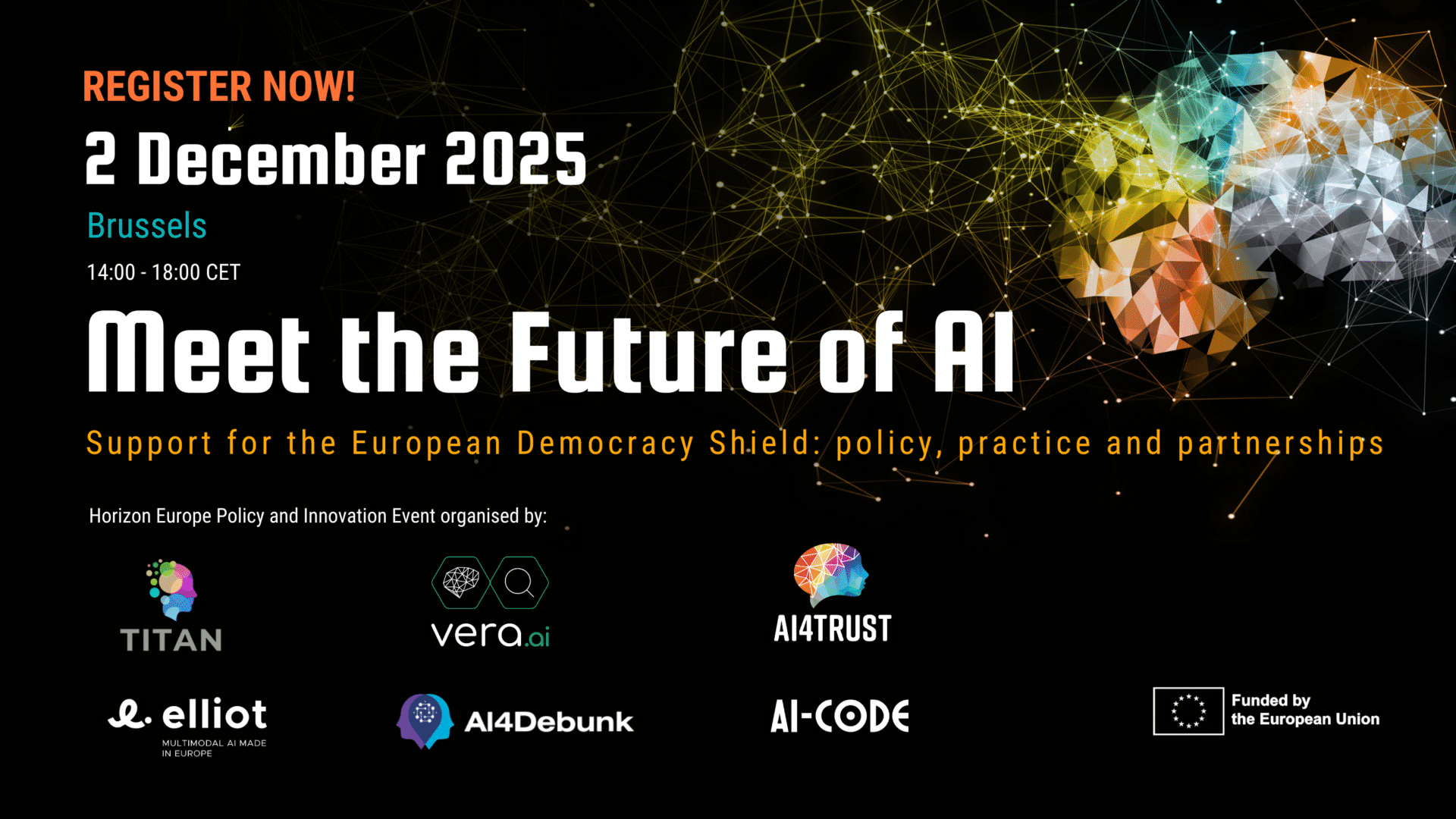 Co-organised by the Horizon Europe projects AI4TRUST AI-CODE, AI4Debunk, TITAN veraΑΙ and ELLIOT, with the support of EU Disinfo Lab and EDMO, this event will showcase how European research and innovation are driving forward new capabilities to detect, assess, and counter disinformation – particularly in the age of generative AI and large-scale digital manipulation.
